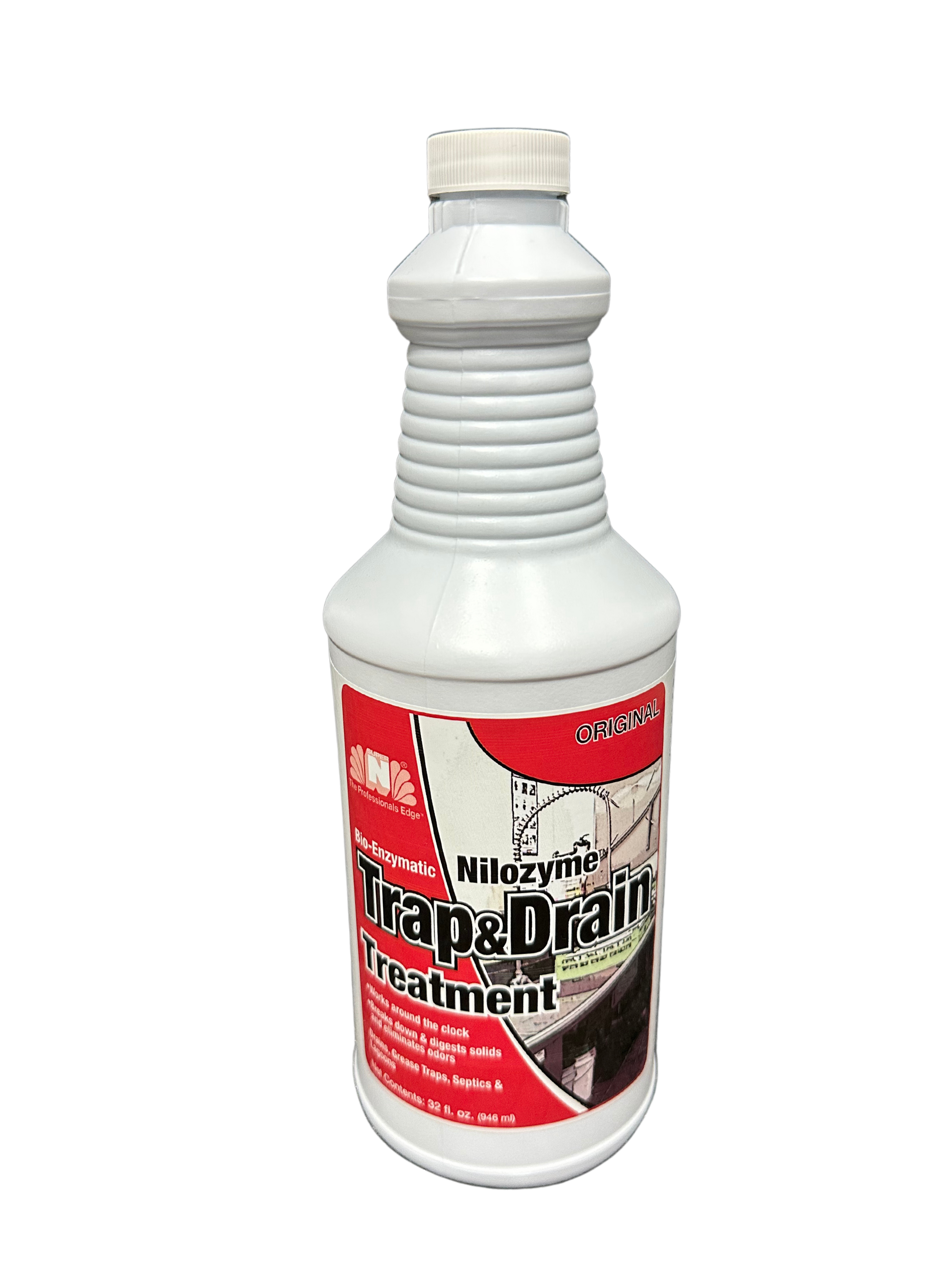 Bio-Enzymatic Trap & Drain Treatment - This trap and drain treatment will liquefy and consume complex proteins, cellulose, starches and other organic waste found in grease traps, drain lines, septic tanks and lagoons. It is a trap and drain treatment that will reduce maintenance of grease traps, septic systems and open clogged drains. Nilozyme has a multi-strain bacterial formulation that will liquefy and digest complex proteins, cellulose and starch. Nilozyme is resilient to bleach, disinfectants and many other cleaning chemicals.